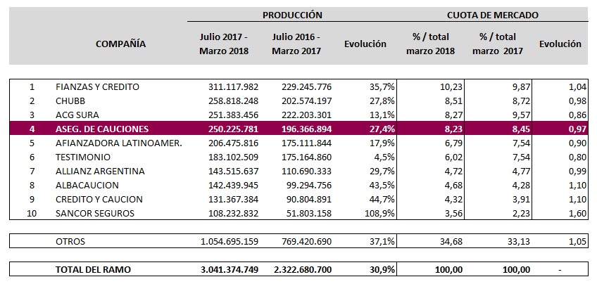El análisis de las cifras del mercado de caución a marzo de 2018 nos permite ver que en el período julio 2017/marzo 2018, CAUCIONES se posiciona en el cuarto puesto del ranking de Compañías, con un crecimiento de casi el 28% con relación al mismo período del año anterior y con un ligero descenso en su cuota de mercado, pasando del 8,45 del año anterior al 8,23 actual.