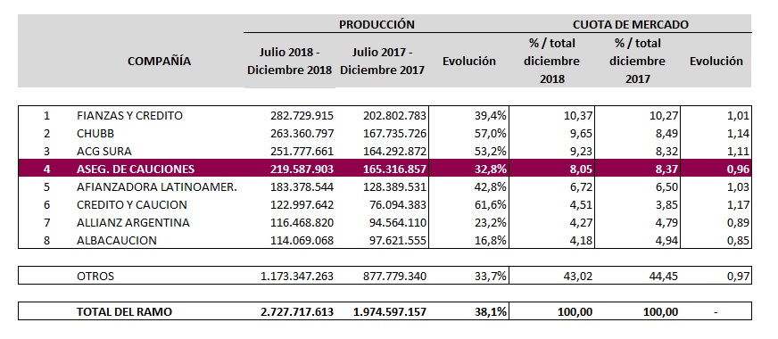 En el período de julio a diciembre de 2018, el mercado de caución tuvo un crecimiento de poco más del 38% con relación al mismo período de 2017, por debajo de la inflación que para ese período fue del 47%. El menor crecimiento del mercado es reflejo de la situación por la que atraviesa la economía argentina. La posición de mercado de Aseguradores de Cauciones mostró una participación del 8,05% (8,37% para el mismo período de 2017).